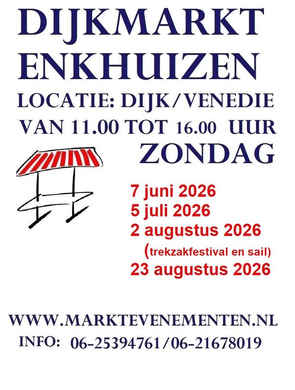 Kom lekker struinen op de markt! Op een aantal zondagen in juni, juli en augustus is er een gezellige markt op de Dijk en het Venedie. Er zijn kramen met kleding, antiek, curiosa en boeken. De markt is van 11.00 uur tot 16.00 uur.