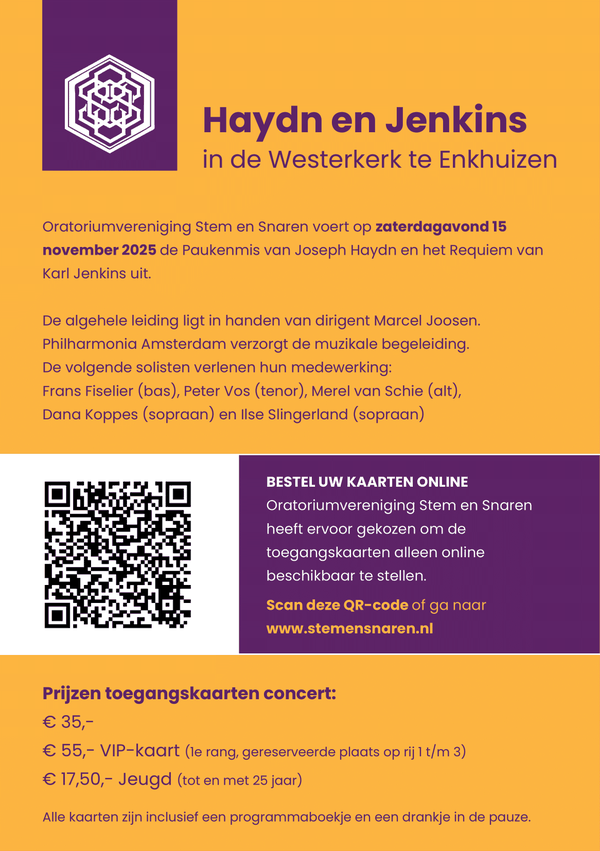 Am Samstag, dem 15. November 2025, gibt die Oratoriengesellschaft Stem en Snaren in Enkhuizen ein besonderes Doppelkonzert: Joseph Haydns Paukenmesse und Karl Jenkins’ Requiem. Beide Werke verbinden gesellschaftliches Engagement mit Musik voller Trost und Hoffnung.